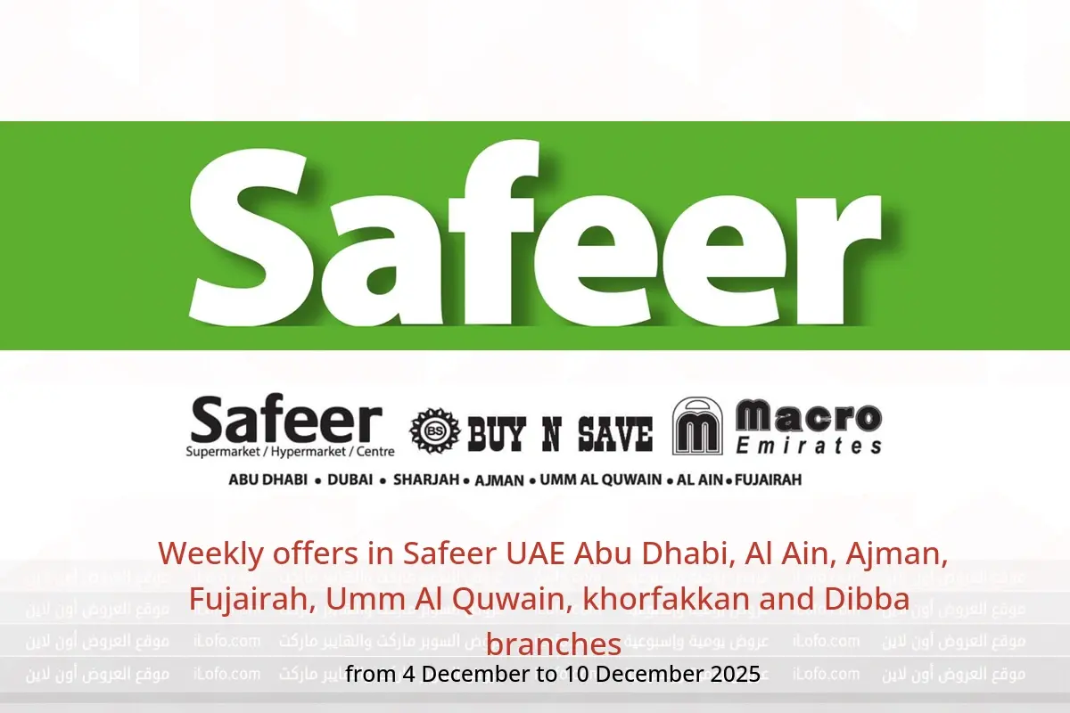 Pictures and prices for Weekly offers in Safeer UAE Abu Dhabi, Al Ain, Ajman, Fujairah, Umm Al Quwain, khorfakkan and Dibba branches and All images shown here are for illustrative purposes only and what is shown here may differ from the actual products And available from Thursday, 4 December 2025 to Wednesday, 10 December 2025.from i L O F O . C O M.