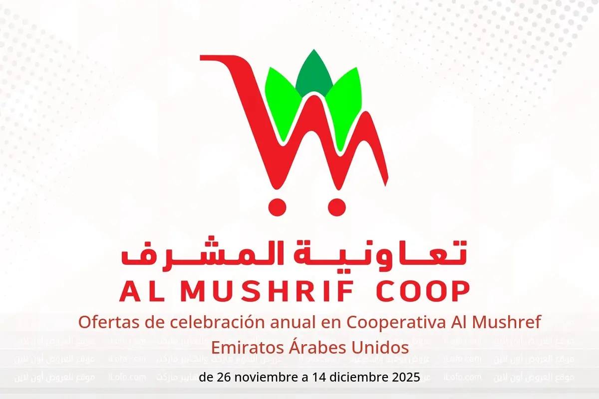 Cooperativa Al Mushref Emiratos Árabes Unidos anuncia nuevos descuentos titulados « Ofertas de celebración anual » disponibles hasta el día 14 diciembre 2025, nuevas ofertas y precios sólo en Emiratos Árabes Unidos.