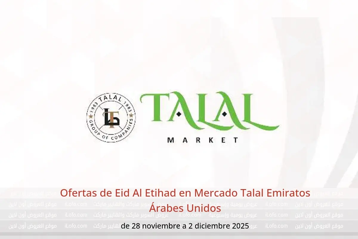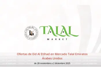 Mercado Talal Emiratos Árabes Unidos anuncia nuevos descuentos titulados « Ofertas de Eid Al Etihad » disponibles hasta el día 2 diciembre 2025, nuevas ofertas y precios sólo en Emiratos Árabes Unidos.