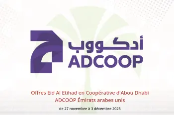Coopérative d'Abou Dhabi ADCOOP Émirats arabes unis annonce de nouvelles réductions intitulées « Offres Eid Al Etihad » disponibles jusqu'au 3 décembre 2025, de nouvelles offres et prix uniquement en Émirats arabes unis.