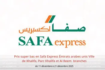 Safa Express Émirats arabes unis dans les branches Ville de Khalifa, Parc Khalifa et Al Reem annonce de nouvelles réductions intitulées « Prix super bas » disponibles jusqu'au 21 décembre 2025, de nouvelles offres et prix uniquement en Émirats arabes unis.